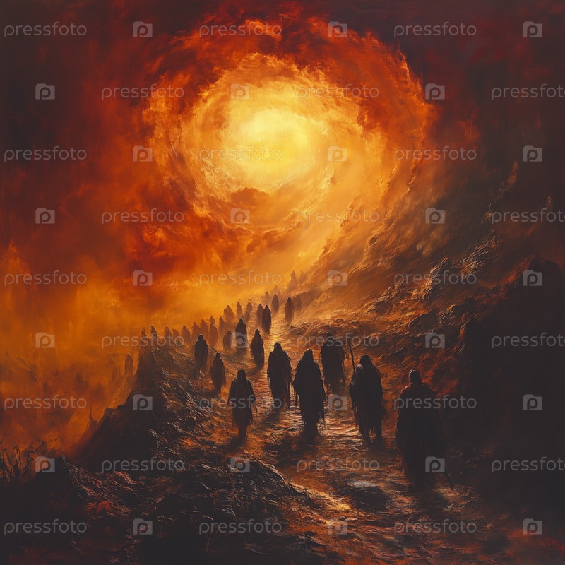 Силуэты фигур, идущих к огненному вихрю на темном ландшафте