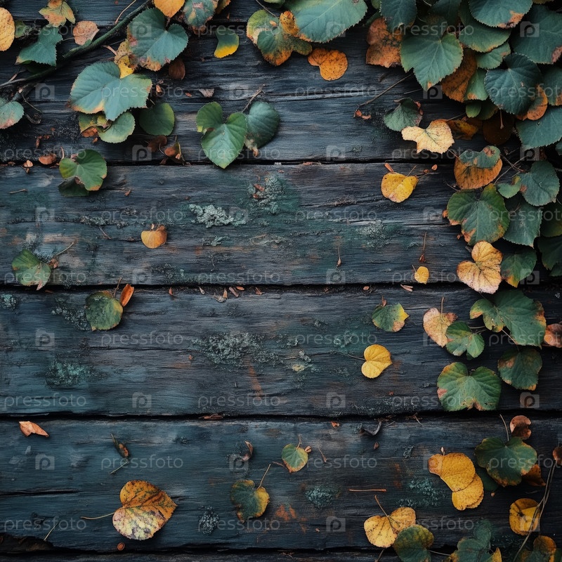 Осенние листья и грецкие орехи на деревенской деревянной поверхности
