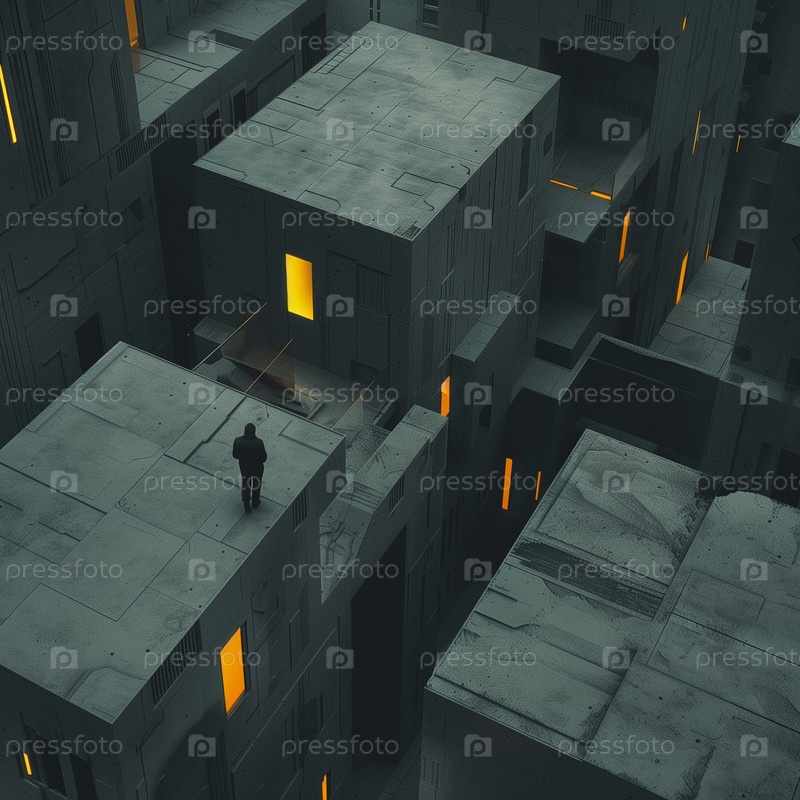 Город в серых тонах. Желтые окна, человек бродит по улицам