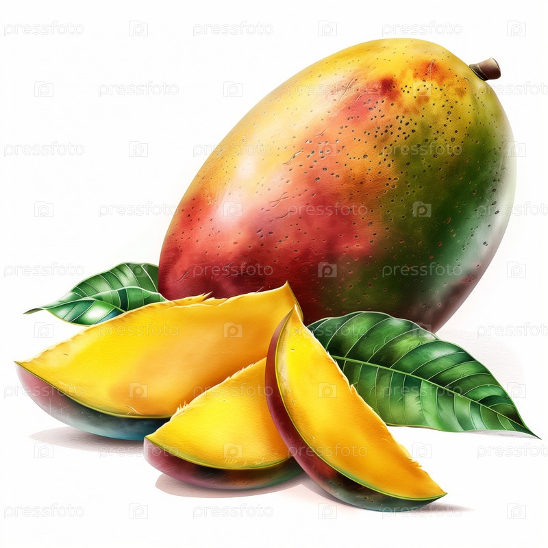Целое и нарезанное манго на белом фоне