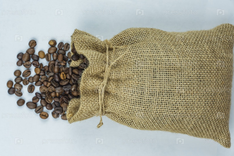 Из мешковины на белом фоне высыпаются жареные кофейные зерна