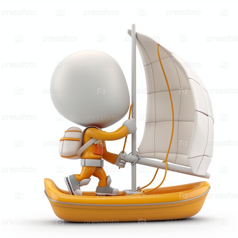 Стикмен плывет на яхте, изолированный на белом фоне