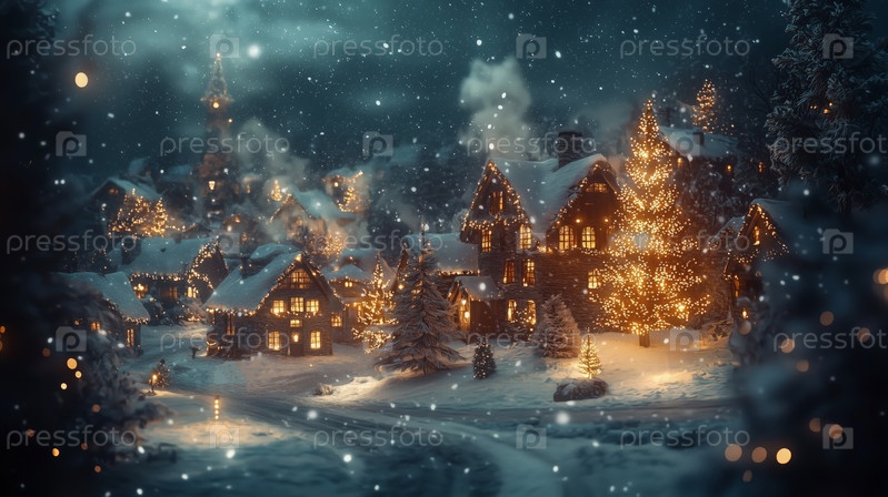 Уютный домик в заснеженном лесу, освещенный рождественскими огнями под полной луной