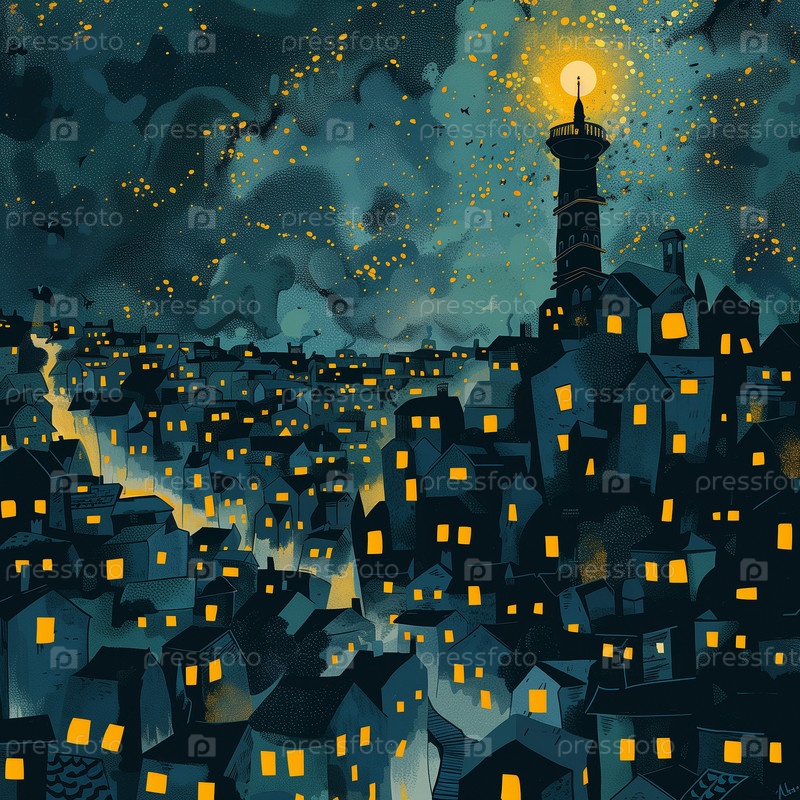 Полуночный город с единственной башней с желтым светом