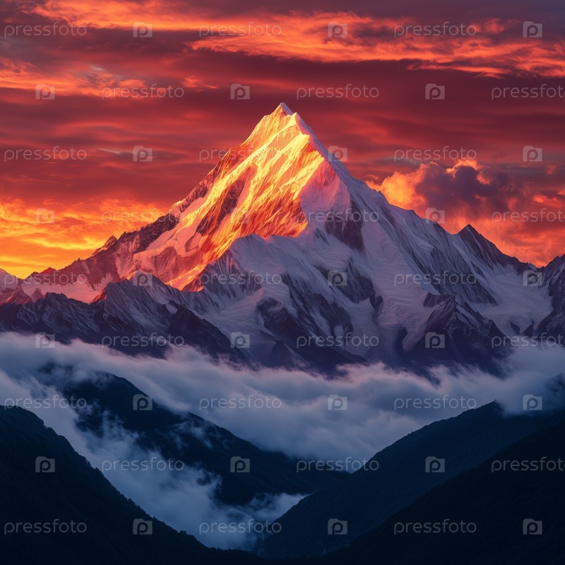 Величественные заснеженные горы на рассвете с огненным небом
