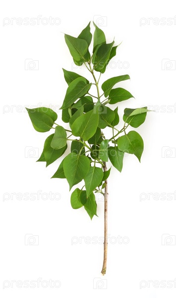 Ветка сирени с зелеными листьями на белом фоне