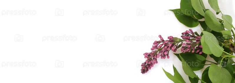Цветущая ветка сирени с зелеными листьями на белом фоне