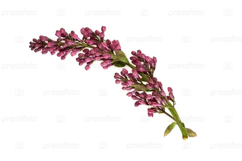 Цветущая ветка сирени с зелеными листьями на белом фоне