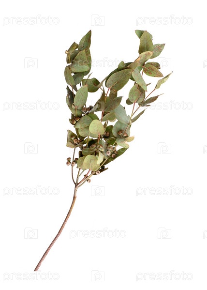 Эвкалипт (Eucalyptus globulus, широко известный как южный голубой эвкалипт) - ветка с плодами, изолированными на белом фоне