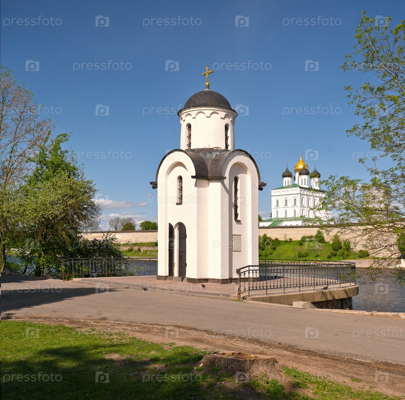Псков, Россия. Ольгинская часовня на берегу реки Великой с видом на Троицкий собор псковского Кремля