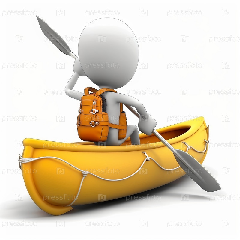 Стикмен гребет в лодке веслами, изолированный на белом фоне