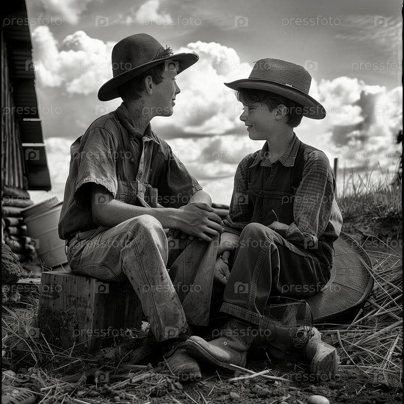 Дружба и командная работа на полях во время посадки и сбора урожая. Дружба между двумя мальчишками. Дружба между двумя детьми. Черно-белое изображение