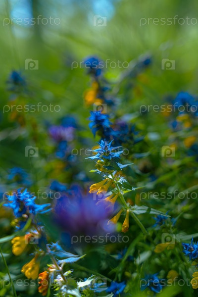 Крупный план цветущих полевых цветов: Марьянник дубравный или Иван-да-Мария (лат. Melampýrum nemorósum)