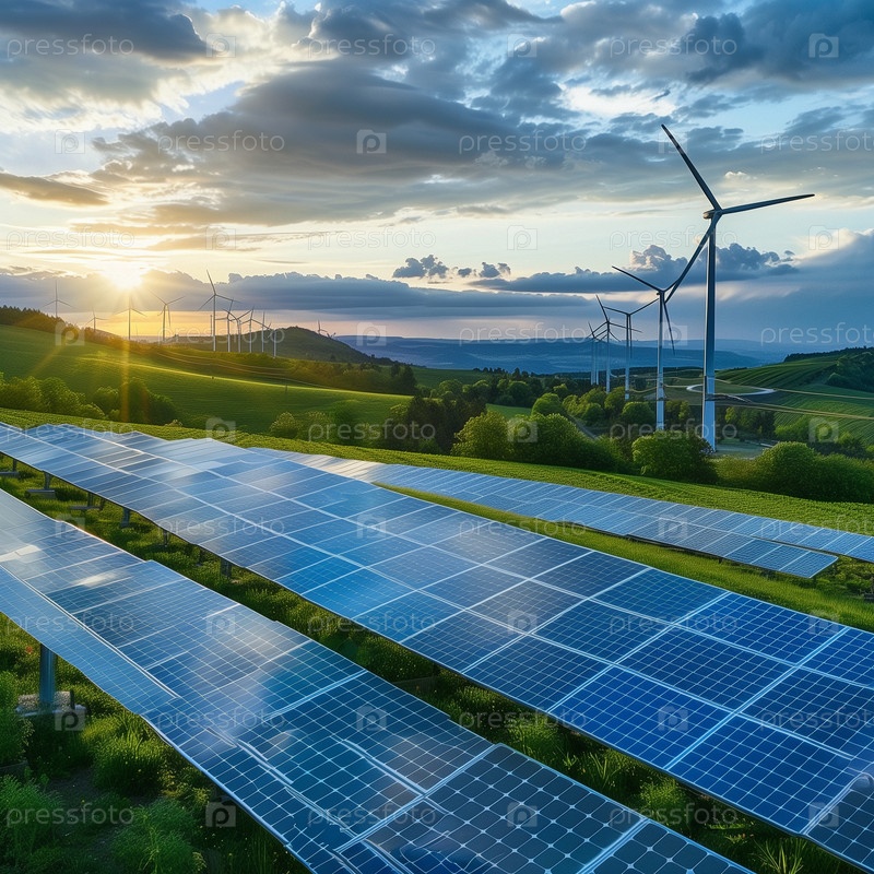 Город с солнечной панелью и ветряными мельницами. Инвестиции в устойчивые проекты и экологически чистые технологии. Профессиональная подготовка