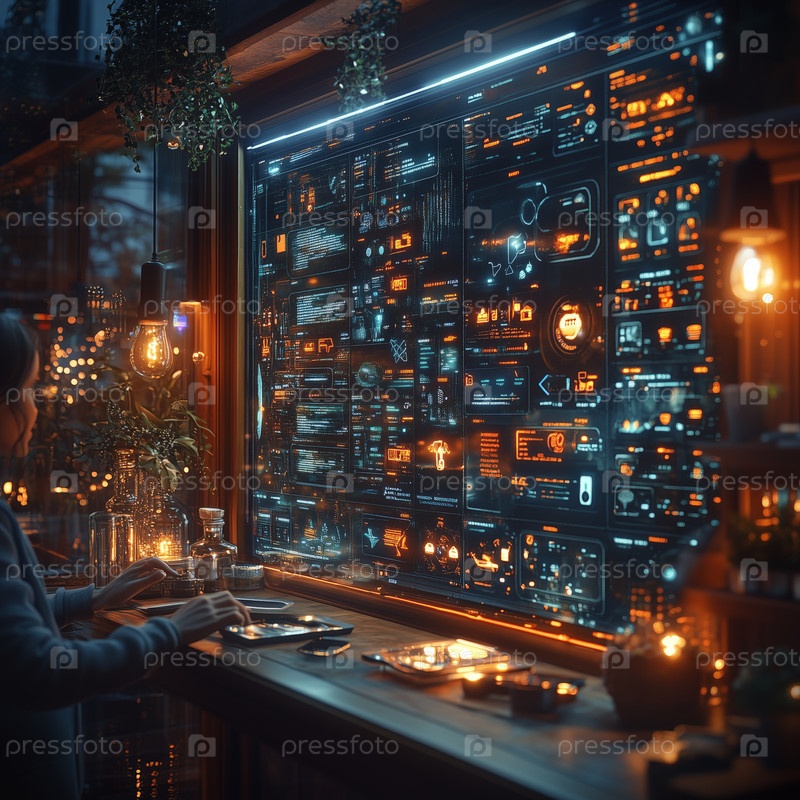 Человек взаимодействует со светящимся голографическим интерфейсом в футуристической городской квартире