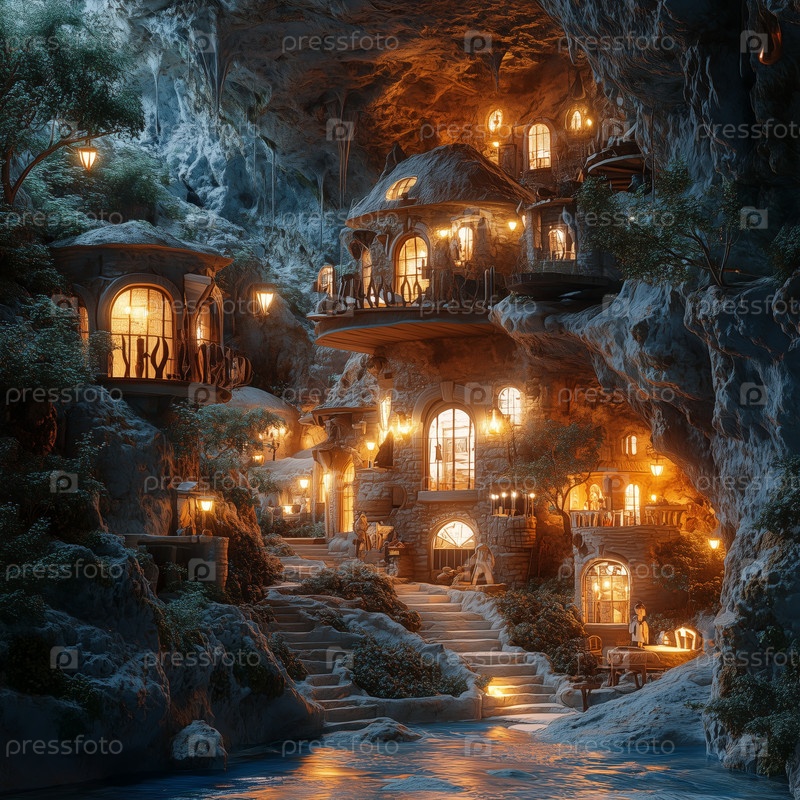 Уютная деревня на скале, освещенная теплыми огнями ночью