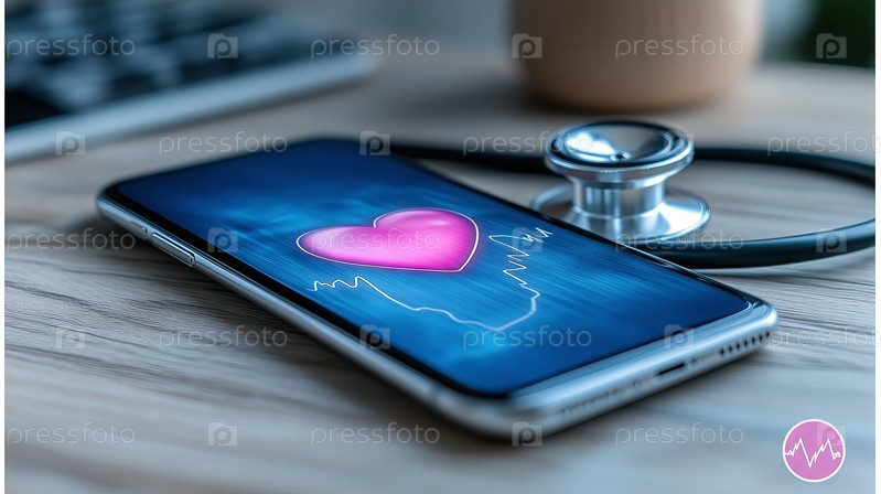 Смартфон с изображением кардиомонитора со стетоскопом на деревянной поверхности