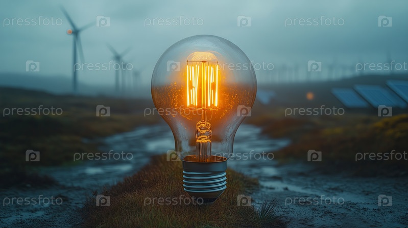 Освещенная лампочка в туманном поле с ветряными турбинами