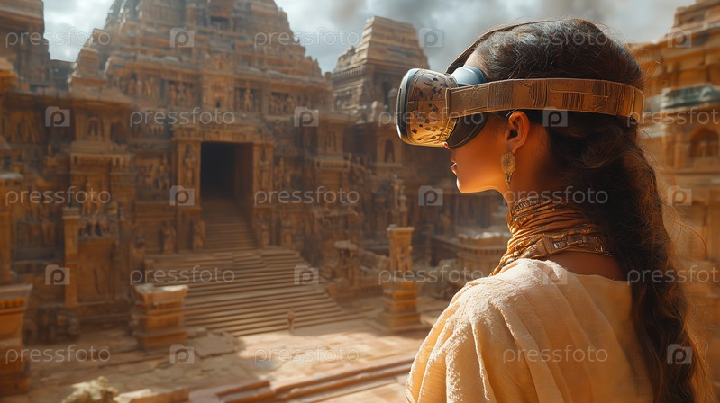 Женщина изучает древнюю храмовую архитектуру с помощью виртуальной реальности