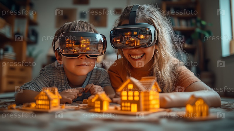 Мать и сын используют очки дополненной реальности для изучения виртуальных моделей домов