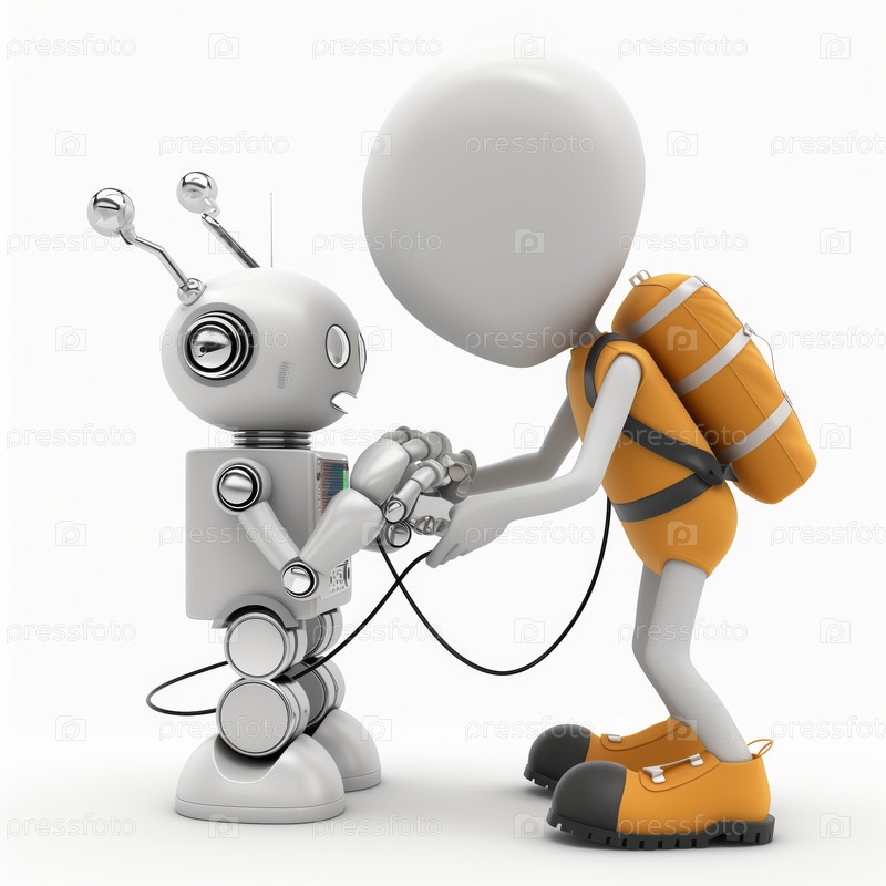 Стикмен работает с роботом на белом фоне