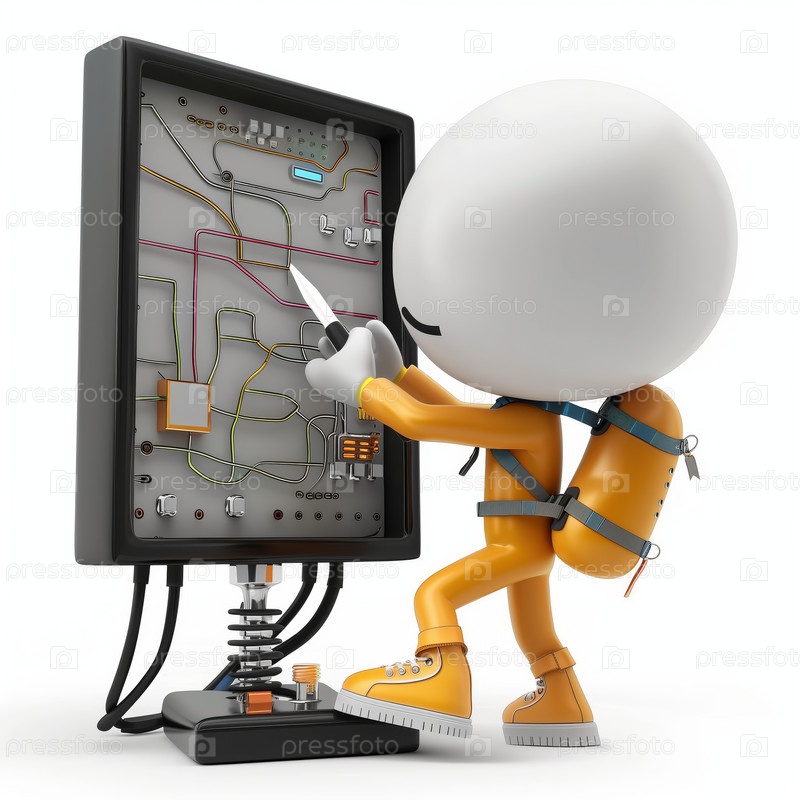 Стикмен ремонтирует электронное устройство с помощью отвертки, изолированный на белом фоне