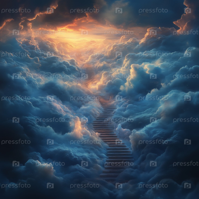 Лестница, ведущая сквозь облака к сияющему свету в небе. Путь на небеса