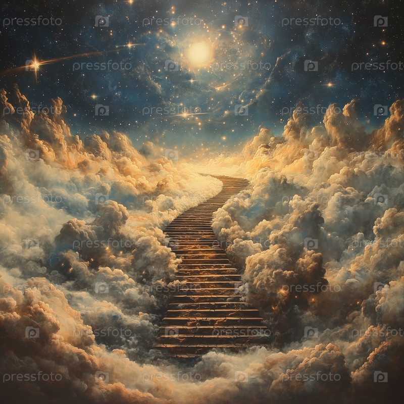 Лестница, ведущая сквозь облака к сияющему свету в небе. Путь на небеса