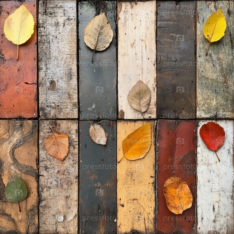 Осенние листья, разложенные на деревянных плитках в сетке