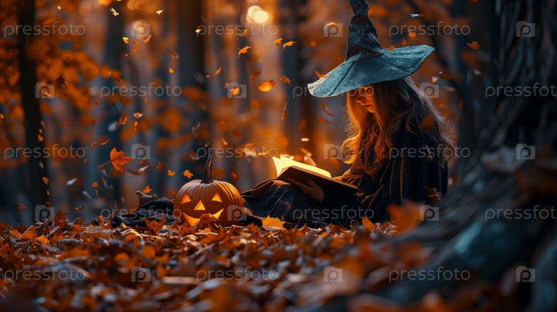 Девушка в шляпе ведьмы читает книгу в осеннем лесу