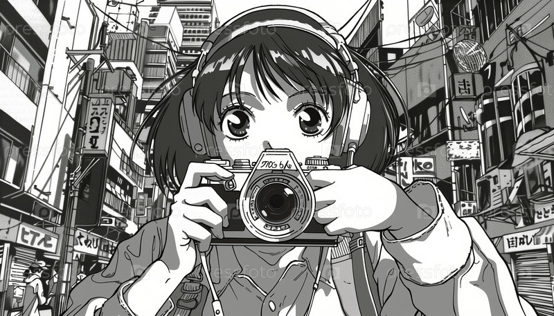 Девушка в стиле манга фотографирует городской пейзаж
