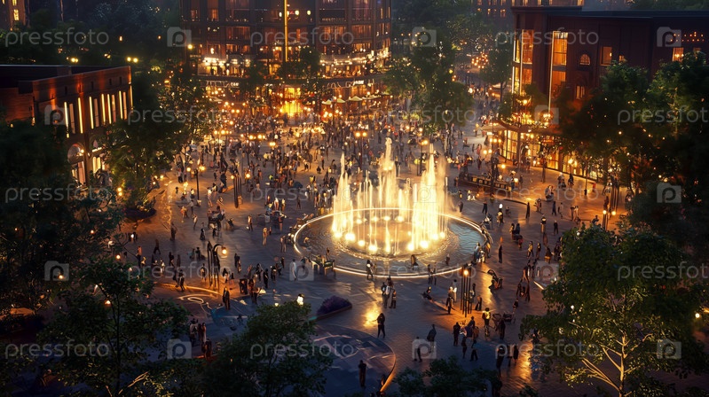 Многолюдная городская площадь, освещенная ночью светящимися огнями