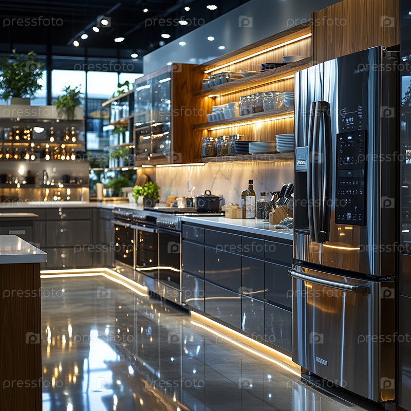 Современная кухня с элегантной техникой и рассеянным освещением