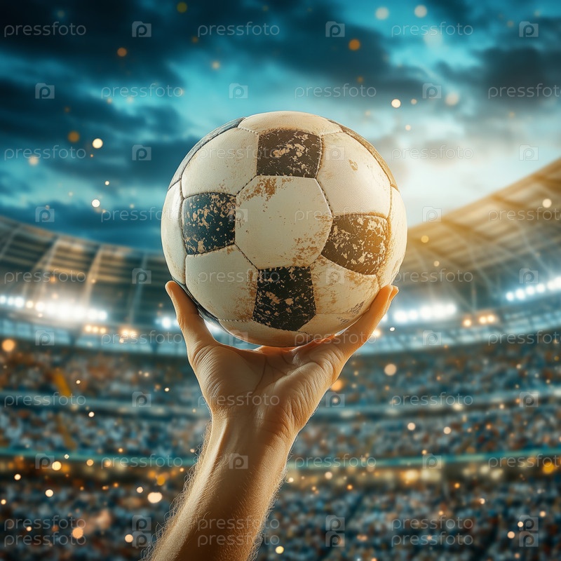 Рука держит футбольный мяч на переполненном стадионе