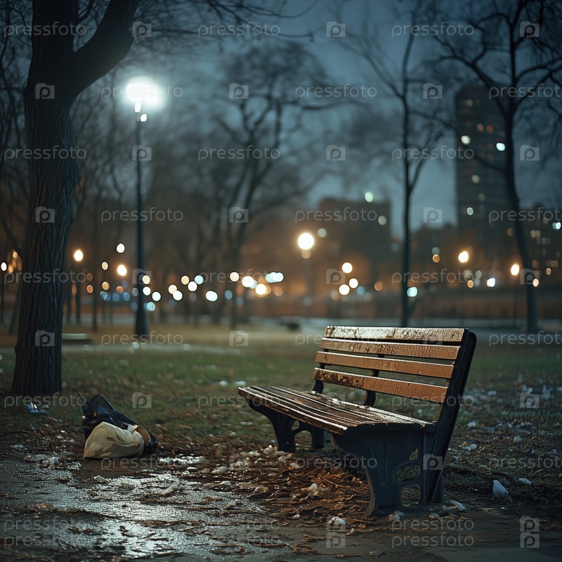 Пустая скамейка в парке на городской улице ночью