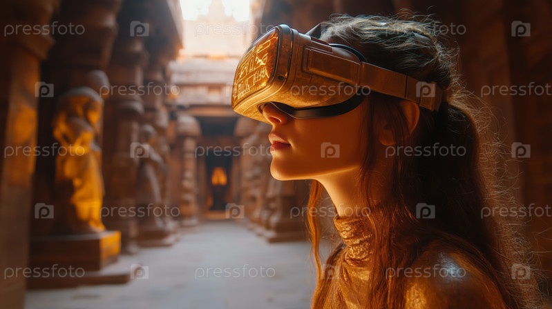 Женщина делает виртуальную экскурсию по древнему храму с помощью VR