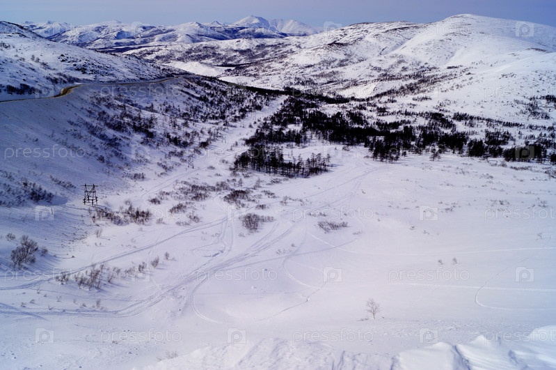 Заснеженные склоны сопок со следами снегоходов в долине. Магаданская область Россия