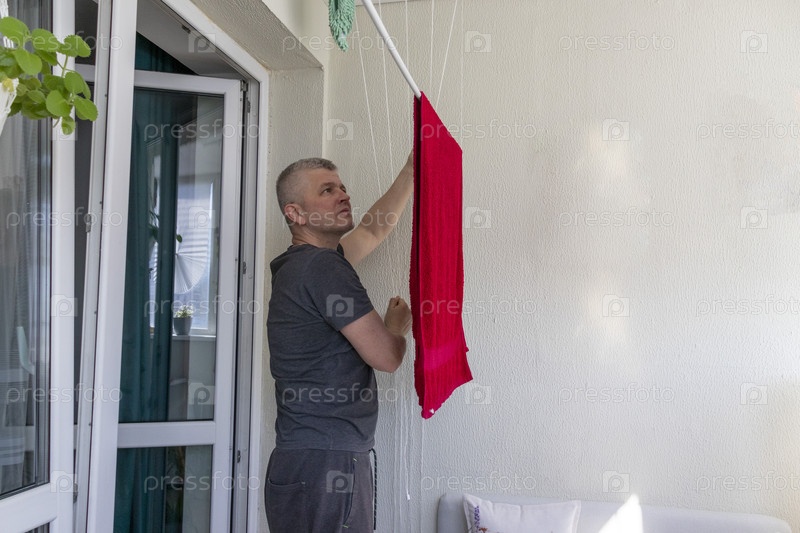 Мужчина развешивает белье на сушилке на балконе. Домашнее хозяйство