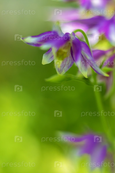Крупный план цветущего фиолетового цветка на зеленом фоне в размытии. Копировать пространство. Водосбор обыкновенный
