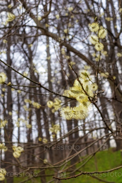 Весеннее цветение желтых сережек ивы в лесной обстановке