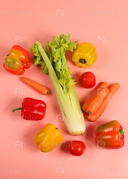 Сладкий болгарский перец, помидоры, сельдерей и морковь на светлом столе. Современный натюрморт различных спелых овощей для здорового вегетарианского питания и детокс-диеты, урожай. Реклама магазина и рынка