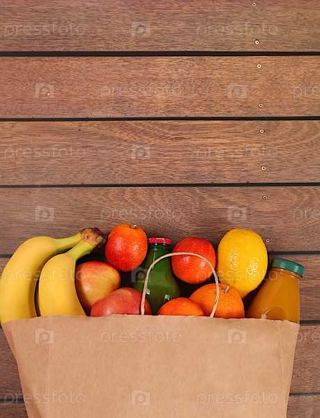 Бумажный эко-пакет со здоровыми веганскими продуктами для похудения. Лимоны, апельсины, помидоры, яблоки, бананы и натуральный сок в крафт-пакете, концепция доставки еды, реклама магазина