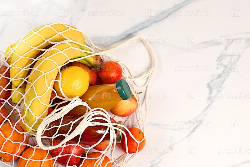 Тканевая сумка для покупок со здоровыми веганскими продуктами для похудения. Лимоны, апельсины, помидоры, яблоки, бананы и натуральный сок в многоразовой сумке, концепция доставки еды, реклама магазина