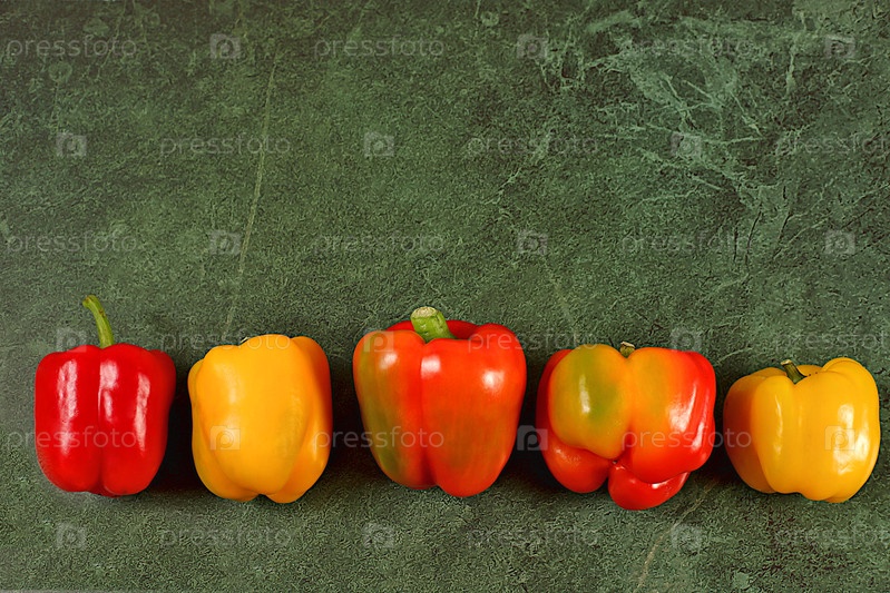 Сладкий перец на зеленом бетонном столе. Различные спелые красные и желтые овощи для здорового вегетарианского питания и детокс-диеты, урожай. Реклама магазина и рынка