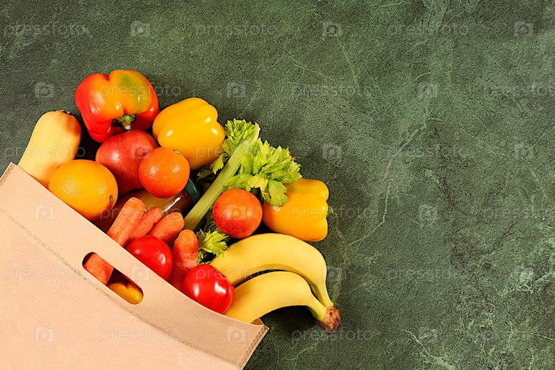 Холщовая эко-сумка со здоровыми веганскими продуктами для похудения. Лимоны, апельсины, помидоры, яблоки, бананы, морковь, сельдерей и натуральный сок в тканевом мешке, концепция доставки еды, реклама магазина