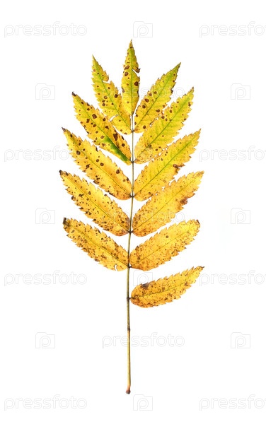Лист рябины с мелкими желтыми листьями на белом фоне