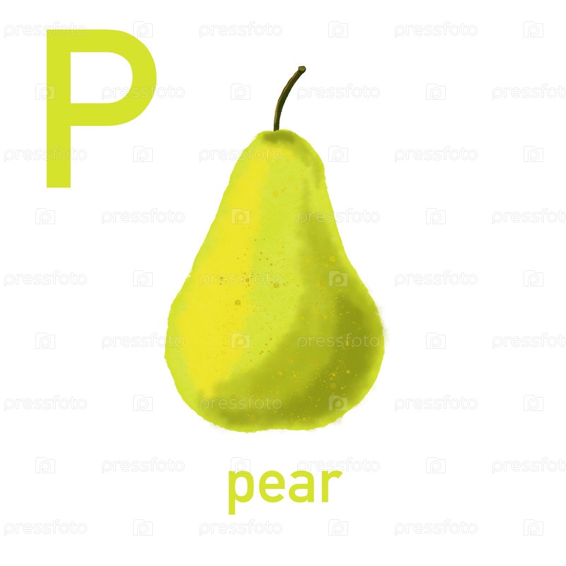 Акварельный английский алфавит из милых фруктов и овощей. Иллюстрация груша