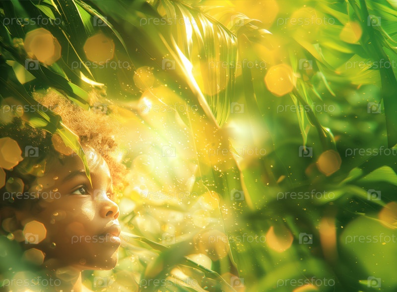 Африканский ребенок в солнечном свете среди тропической растительности, детей и природы