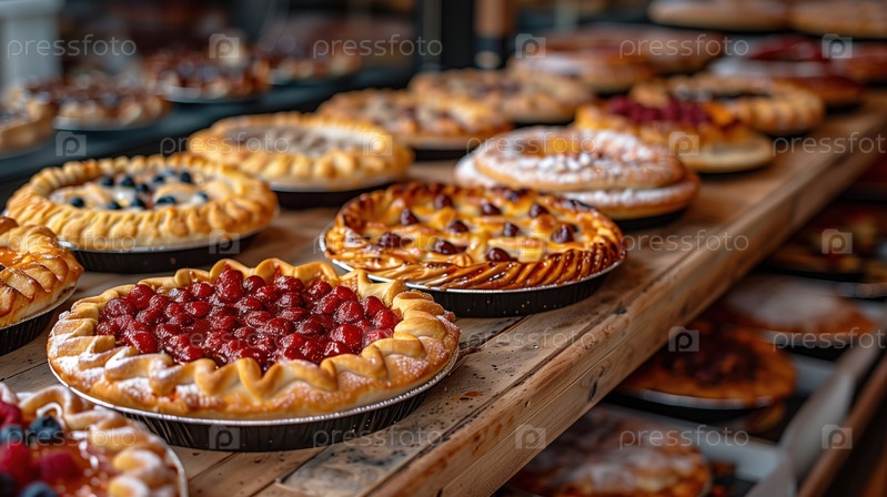 Разные фруктовые торты на прилавке пекарни