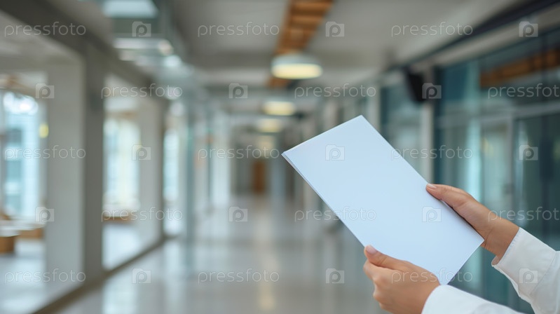 Женская рука держит белый лист бумаги в коридоре офиса